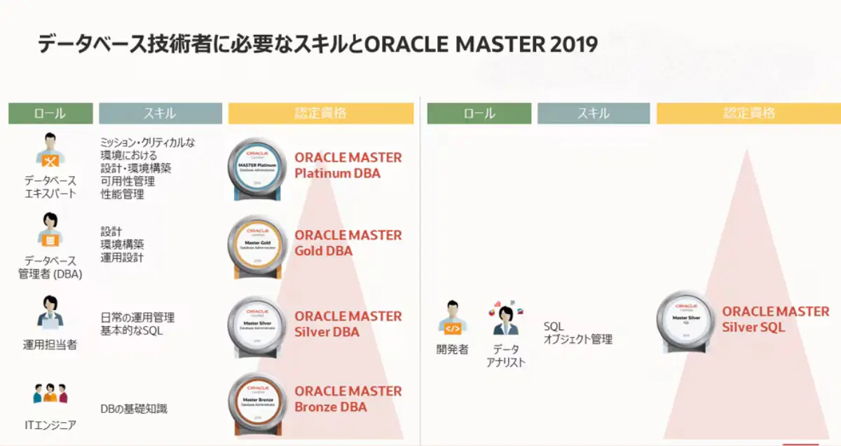 日本オラクル株式会社が提供するORACLE MASTERは、データベースにかかわるスキルを証明する認定資格です。資格保有者は、データベースのクラウド移行や性能問題に対応できる専門家として高く評価できます。