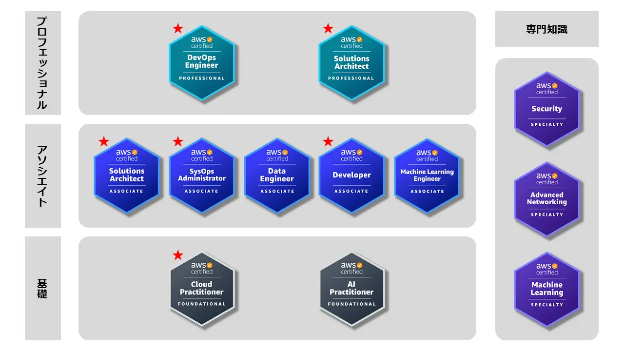AWSクラウドを利用したシステムの設計・運用・開発に関する実践的なスキルを証明するレベルです。
