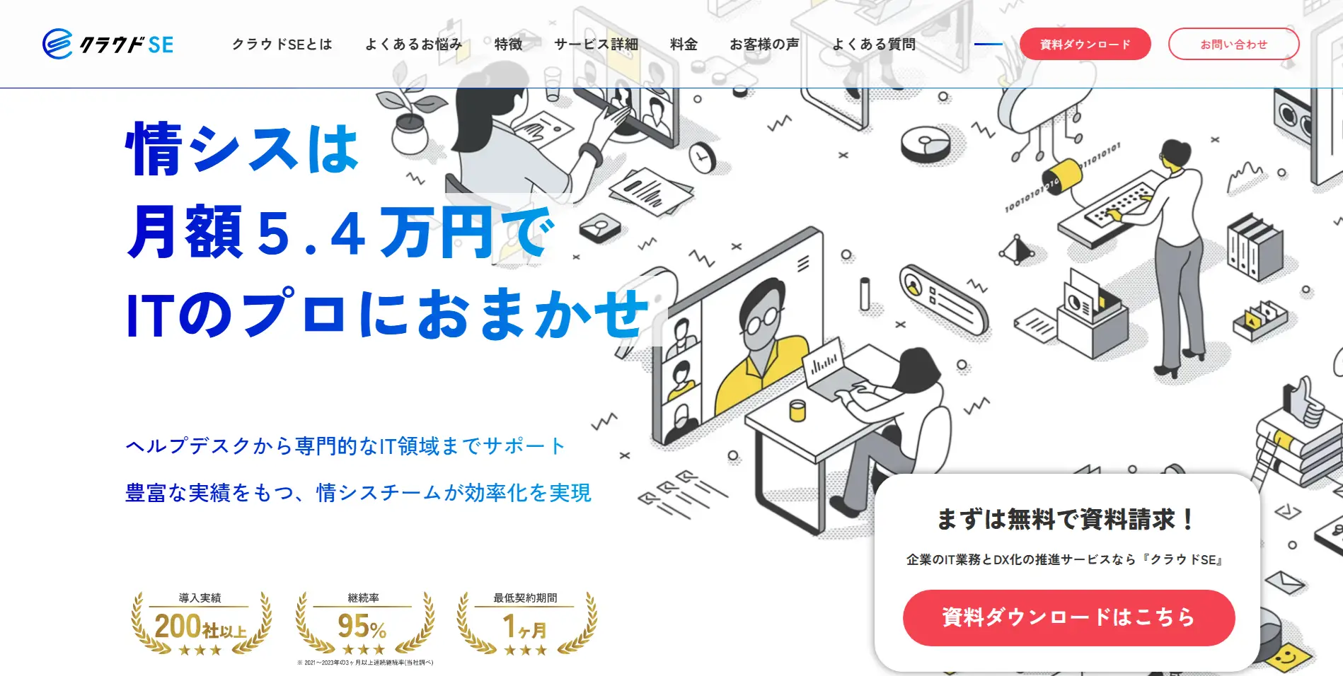 クラウドSEは、情シス業務を月額制で外部委託できるアウトソーシングサービスです。ヘルプデスク対応からサーバーの運用・保守まで幅広い業務に対応しています。