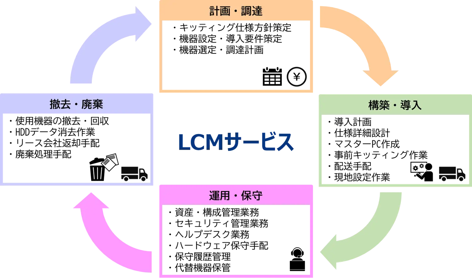 ライフサイクルマネジメントサービスは、PCやスマホなどのIT資産を計画〜廃棄まで一貫して代行するアウトソーシングサービスです。ライフサイクル全体をワンストップで管理できる体制に特徴があり、機器の調達・設定から在庫管理まで一元管理します。