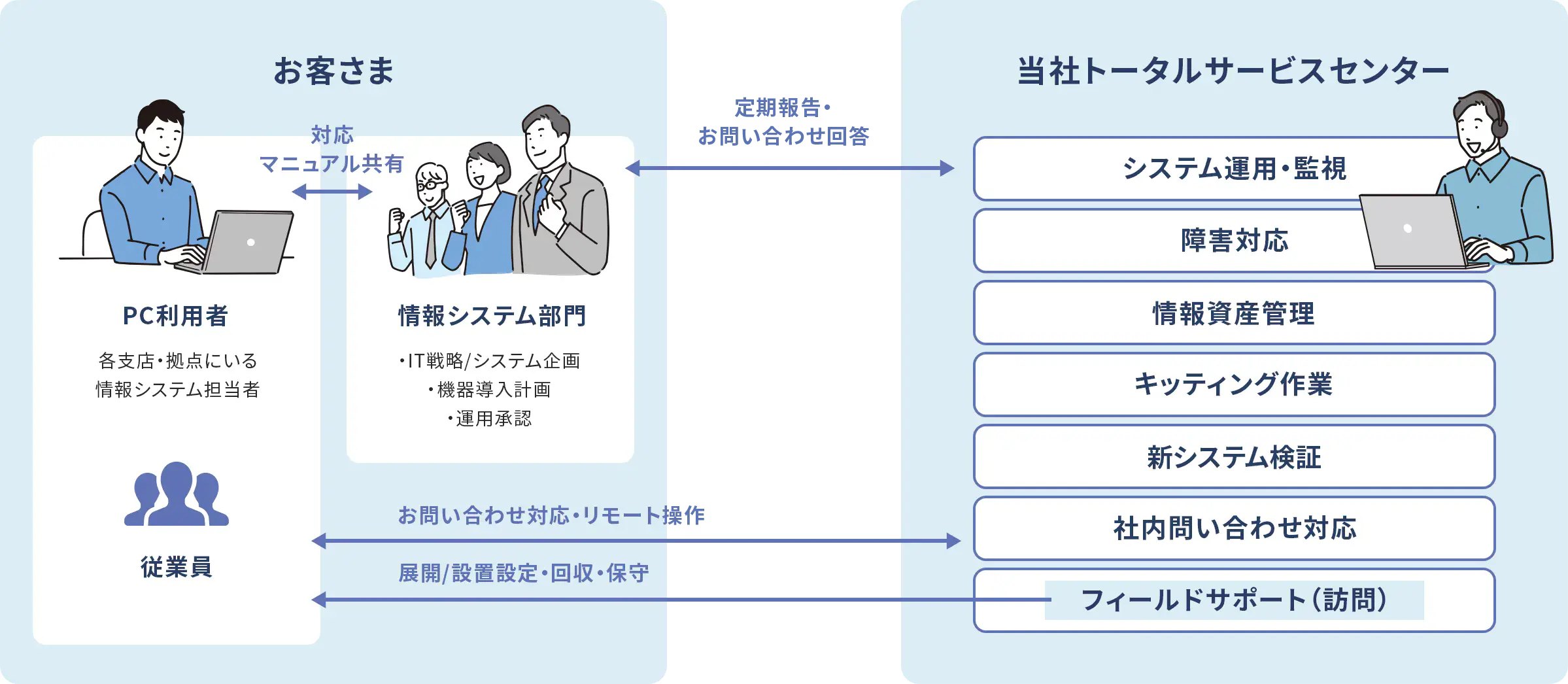 まるごと情シス代行は、システム運用やPCキッティングなどの日常的な情シス業務を代行するアウトソーシングサービスです。テクニカルサポートで培った25年以上の実績があり、ITスキルの高い人材が揃っています。