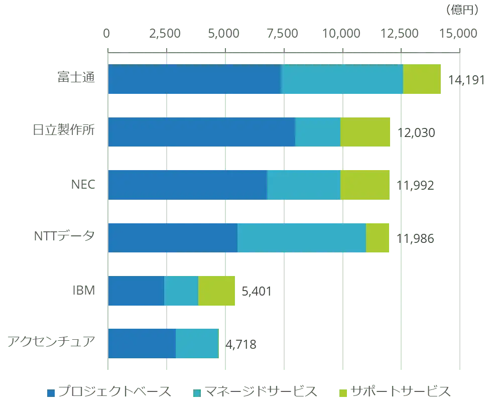 ▲出典:国内ITサービス市場 主要ベンダーサービスセグメント別売上額、2024年|IDC Japan 株式会社国内のITサービス市場には、長い歴史と豊富な実績をもつ大手ITベンダーが数多く存在します。IDC Japanが公表したデータによると、2024年の国内ITサービス市場におけるベンダー売上額の上位には以下の企業が名を連ねています。