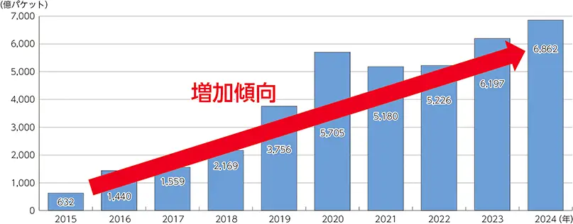 国立研究開発法人情報通信研究機構(NICT)が開発したNICTERによると、2015年から2024年までに観測したサイバー攻撃関連の通信数は約10.8倍に増加しています。