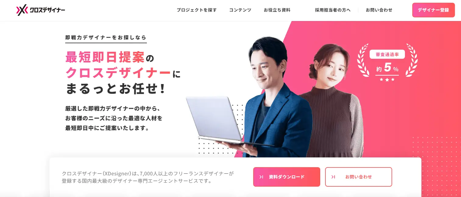 フリーランスデザイナーに特化した国内最大規模の専門職エージェント「クロスデザイナー」。厳正な審査を通過した実績豊富なデザイナーが在籍しており、高度な要求に応えられる人材とのマッチングを期待できます。