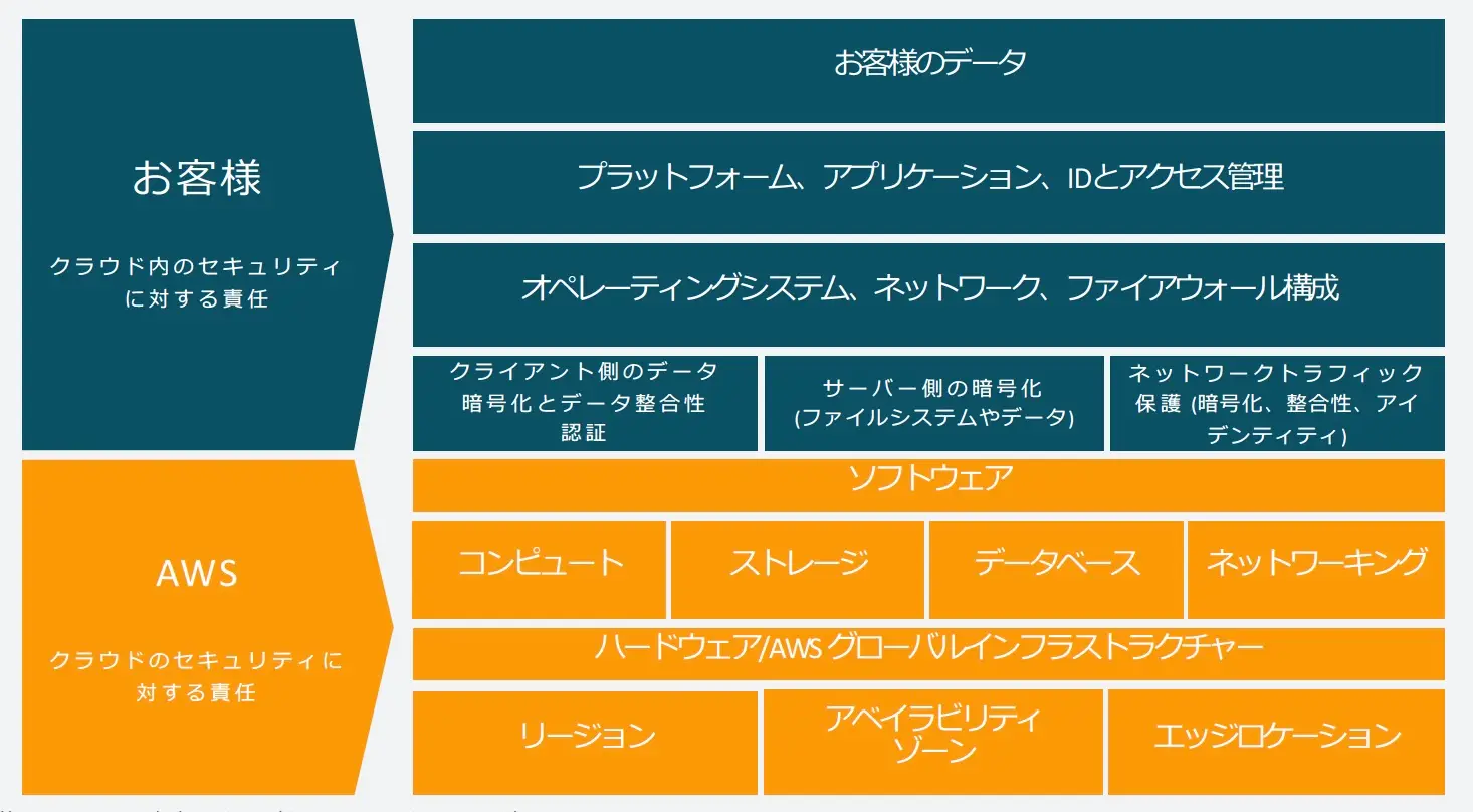 サーバーやネットワークなど、クラウドの基盤部分の責任はAWSが負います。一方で、アプリやデータの管理、パフォーマンスの監視などは利用者側の責任範囲です。